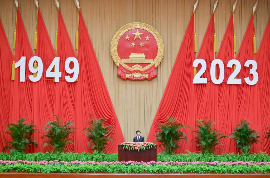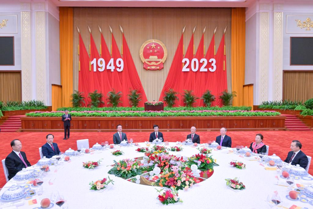 Wang Huning, a member of the Standing Committee of the Political Bureau of the Communist Party of China (CPC) Central Committee and chairman of the National Committee of the Chinese People's Political Consultative Conference (CPPCC), addresses a reception held in Beijing to celebrate the upcoming 74th anniversary of the founding of the People's Republic of China at the Great Hall of the People in Beijing, capital of China, Sept. 25, 2023. The reception was organized by the General Office of the CPPCC National Committee, the United Front Work Department of the CPC Central Committee, the Overseas Chinese Affairs Office of the State Council, the Hong Kong and Macao Affairs Office of the State Council, the Taiwan Affairs Office of the State Council and the All-China Federation of Returned Overseas Chinese. (Xinhua/Gao Jie)