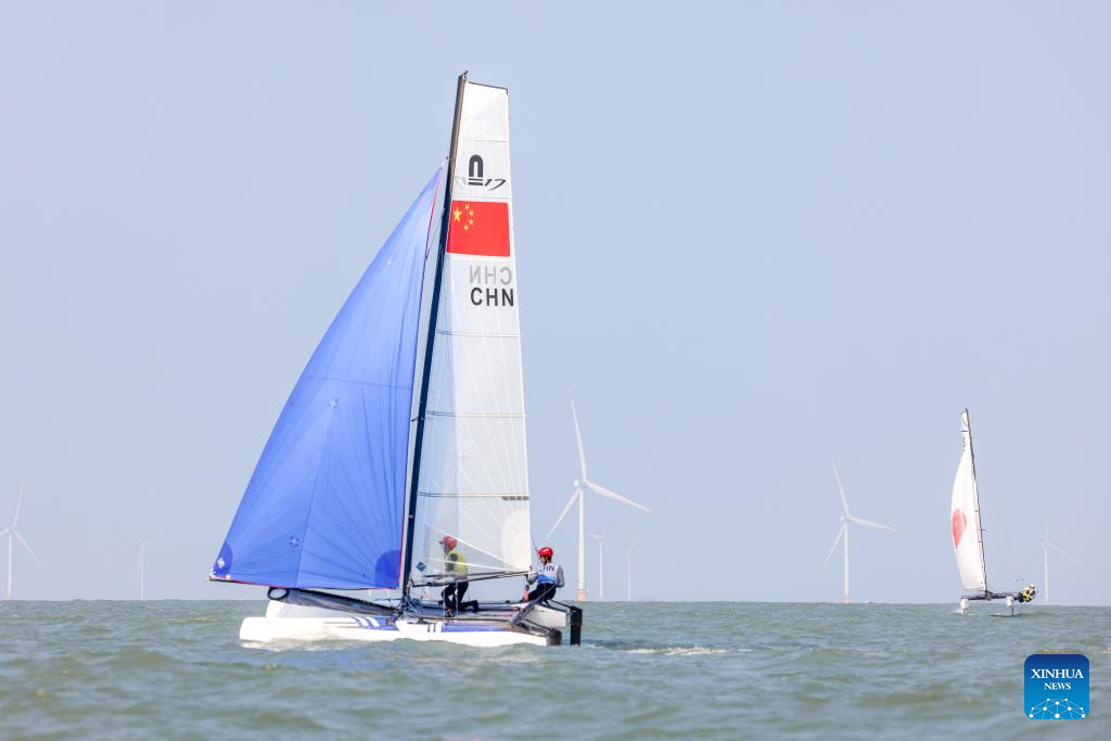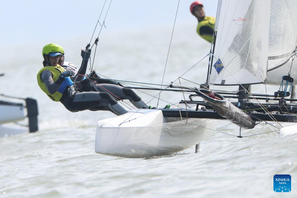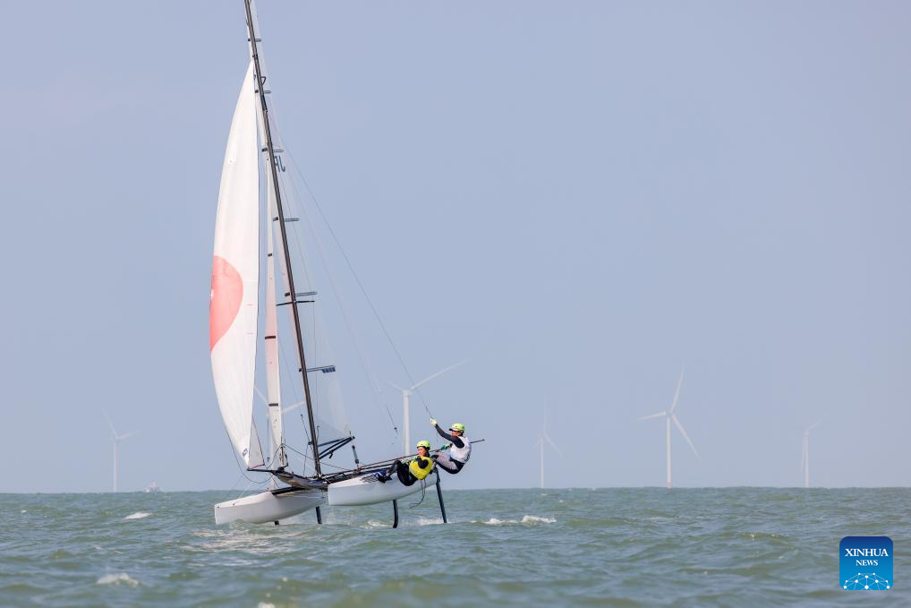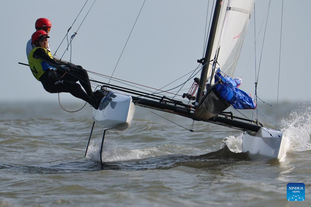 Iitsuka Shibuki/Nishida Capiglia Oura of Japan compete during the Mixed Multihull Nacra 17 Race of Sailing at the 19th Asian Games in Ningbo, east China's Zhejiang Province, Sept. 25, 2023. (Xinhua/Zhang Tao)