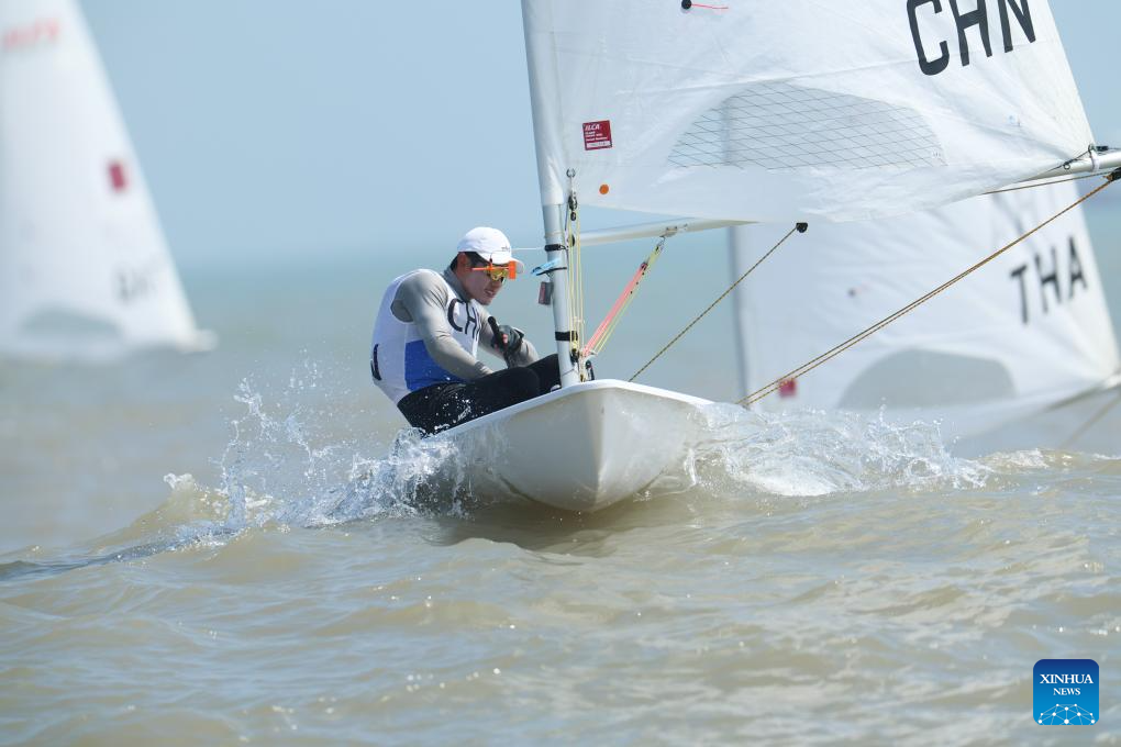 Cui Yinsheng of China competes during the Men's Single Dinghy ILCA7 Race of Sailing at the 19th Asian Games in Ningbo, east China's Zhejiang Province, Sept. 25, 2023. (Xinhua/Zhang Tao)
