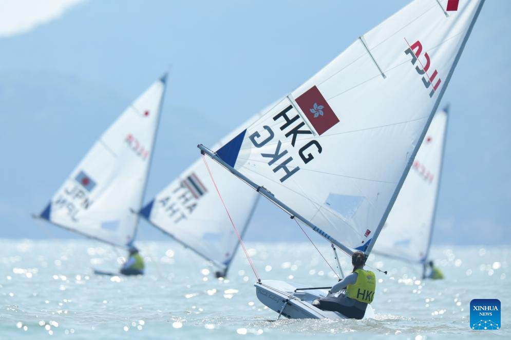 Stephanie Louise Norton of China's Hong Kong competes during the Women's Single Dinghy ILCA6 Race of Sailing at the 19th Asian Games in Ningbo, east China's Zhejiang Province, Sept. 25, 2023. (Xinhua/Zhang Tao)