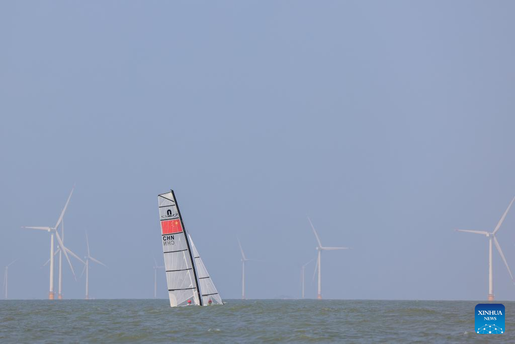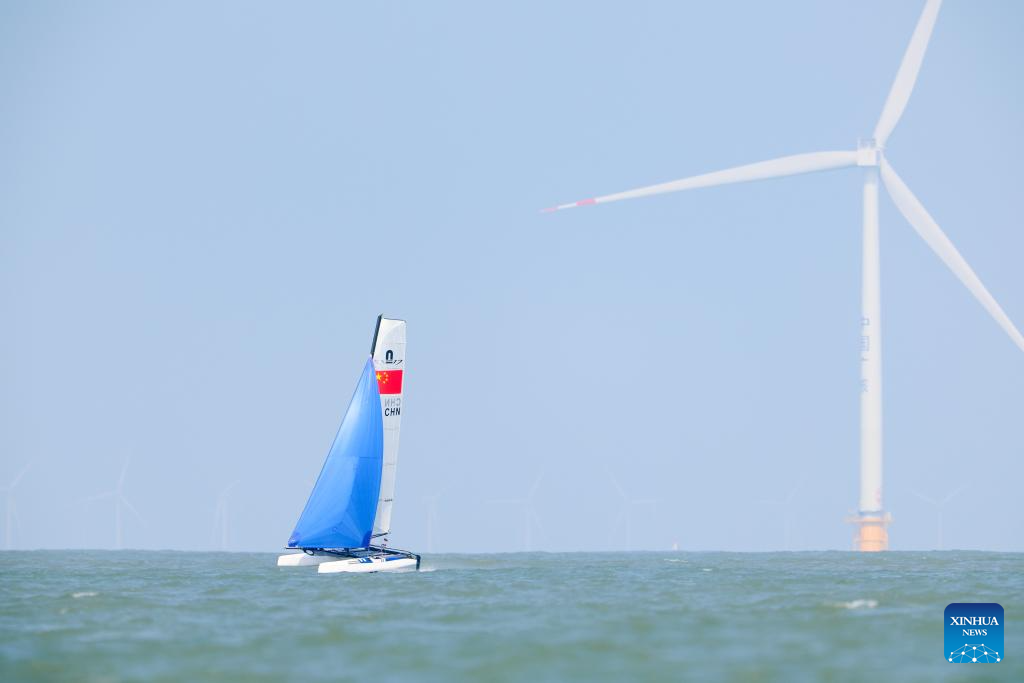 Zhao Huancheng/Wang Saibo of China compete during the Mixed Multihull Nacra 17 Race of Sailing at the 19th Asian Games in Ningbo, east China's Zhejiang Province, Sept. 25, 2023. (Xinhua/Zhang Tao)