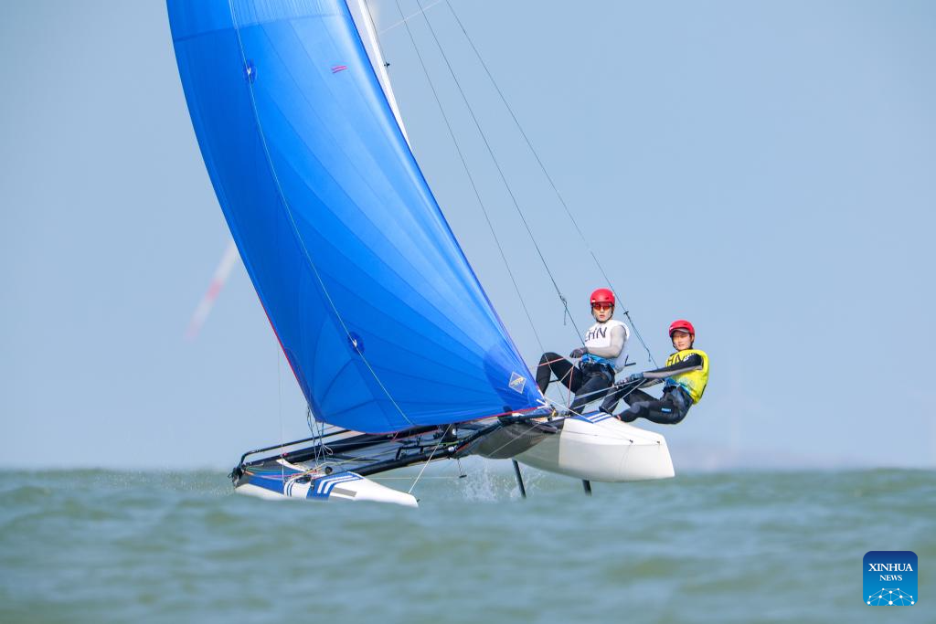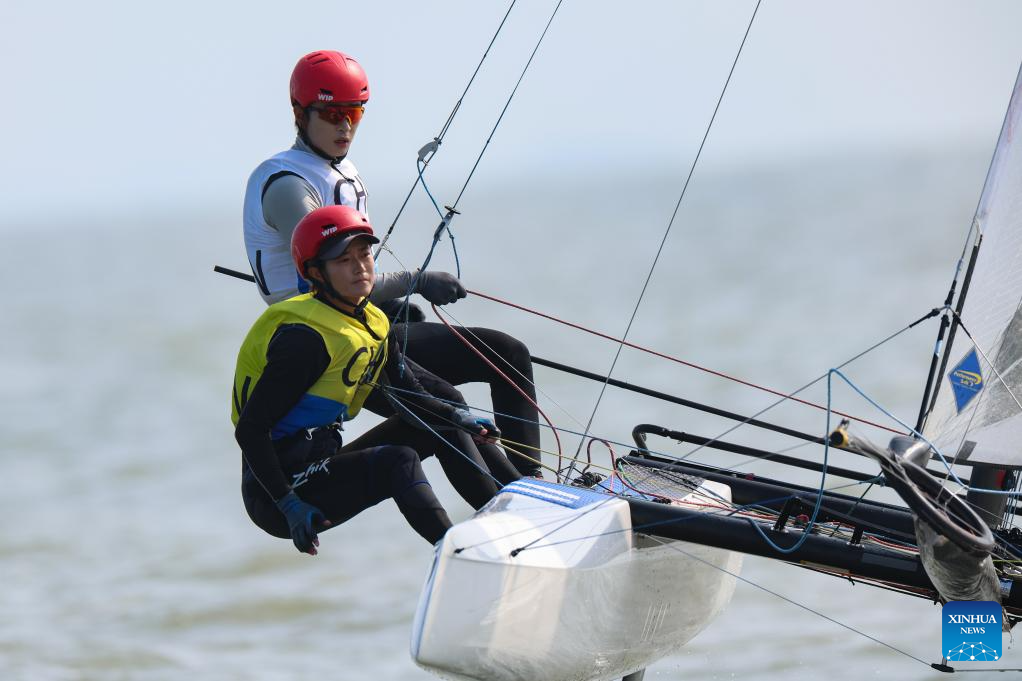 Zhao Huancheng/Wang Saibo (R) of China compete during the Mixed Multihull Nacra 17 Race of Sailing at the 19th Asian Games in Ningbo, east China's Zhejiang Province, Sept. 25, 2023. (Xinhua/Zhang Tao)