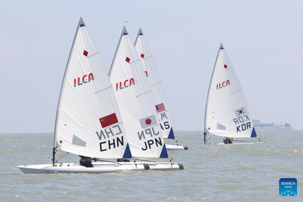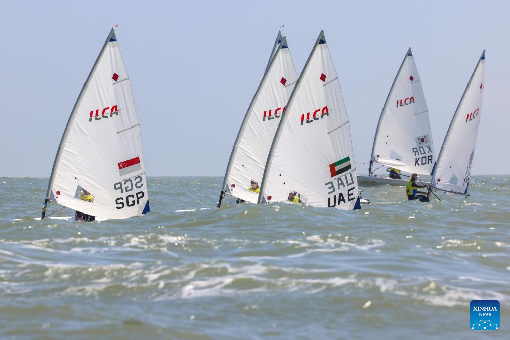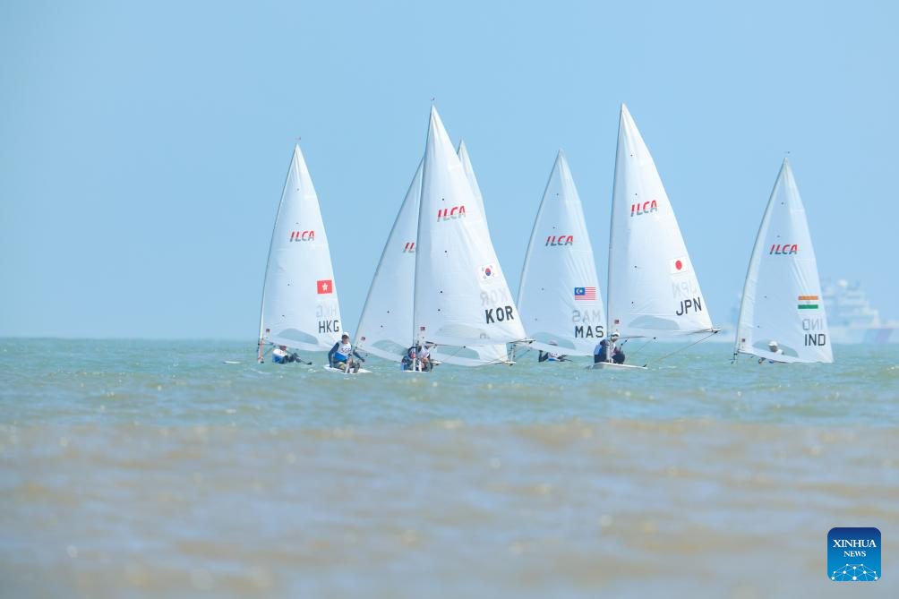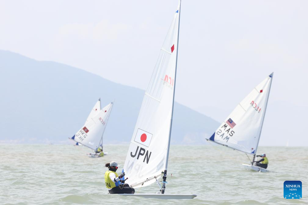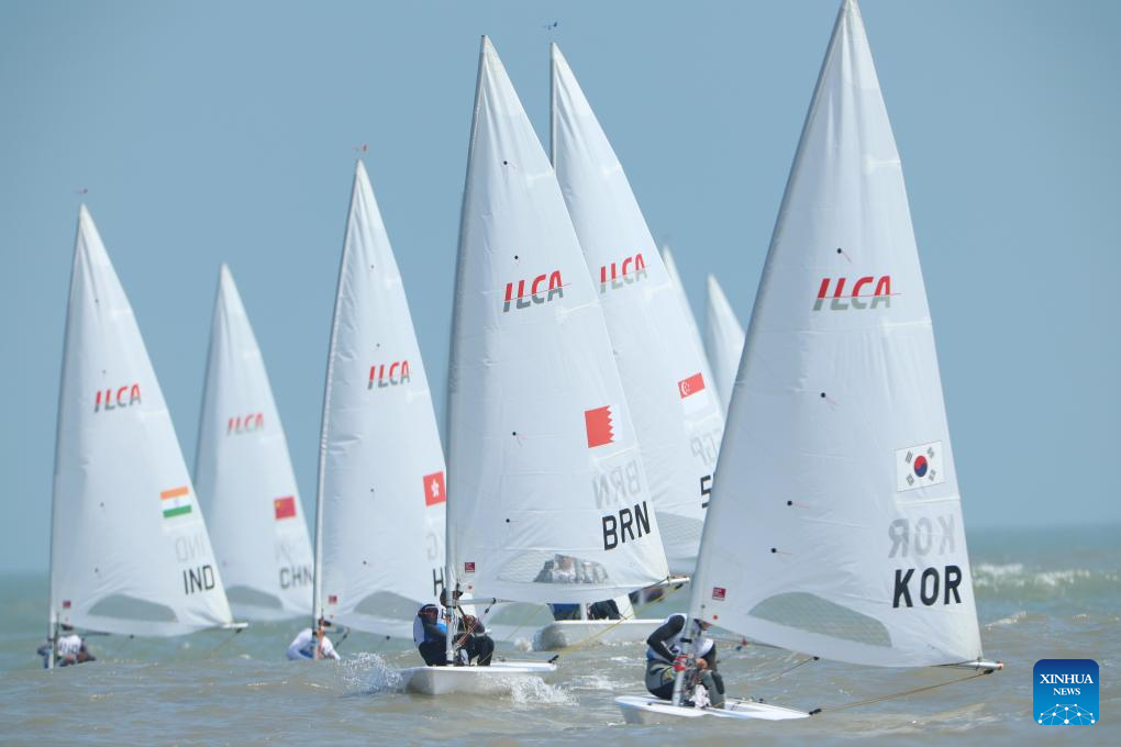 Sailors compete during the Men's Single Dinghy ILCA7 Race of Sailing at the 19th Asian Games in Ningbo, east China's Zhejiang Province, Sept. 25, 2023. (Xinhua/Zhang Tao)