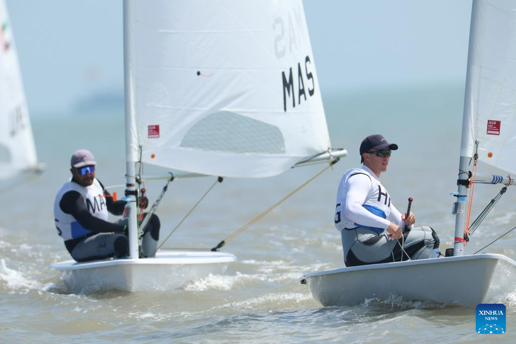 Nicholas Brian Bezy (R) of China's Hong Kong competes during the Men's Single Dinghy ILCA7 Race of Sailing at the 19th Asian Games in Ningbo, east China's Zhejiang Province, Sept. 25, 2023. (Xinhua/Zhang Tao)