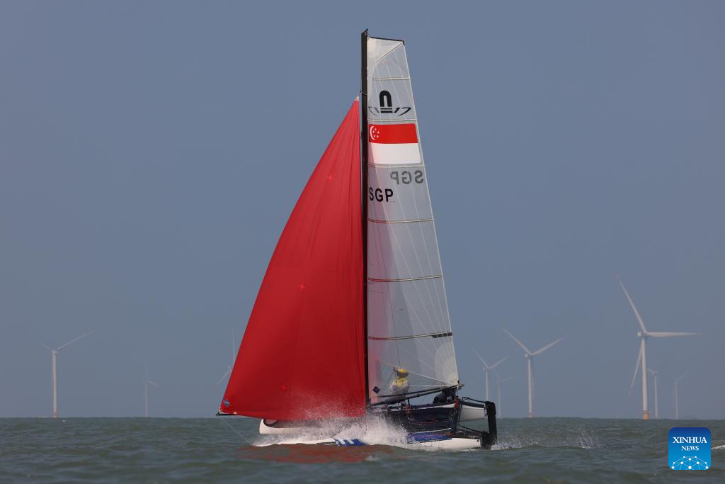 Liu Xiaman Justin/Lim Ke Xin Denise of Singapore compete during the Mixed Multihull Nacra 17 Race of Sailing at the 19th Asian Games in Ningbo, east China's Zhejiang Province, Sept. 25, 2023. (Xinhua/Zhang Tao)
