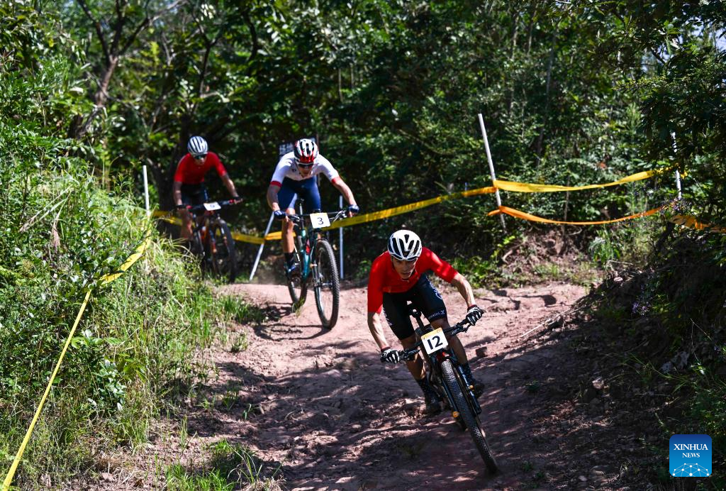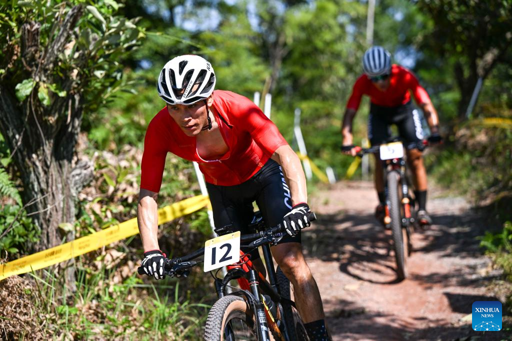 Mi Jiujiang (front) of China competes during the Cycling Mountain Bike Men's Cross Country Olympic at the 19th Asian Games in Hangzhou, east China's Zhejiang Province, Sept. 25, 2023. (Xinhua/Hu Huhu)