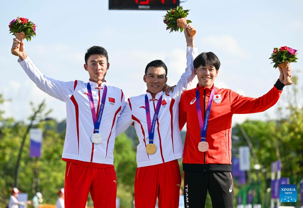 Gold Medallist Mi Jiujiang (C) of China, Silver Medallist Yuan Jinwei (L) of China and Bronze Medallist Sawada Toki of Japan attend the awarding ceremony for Cycling Mountain Bike Men's Cross Country Olympic at the 19th Asian Games in Hangzhou, east China's Zhejiang Province, Sept. 25, 2023. (Xinhua/Hu Huhu)