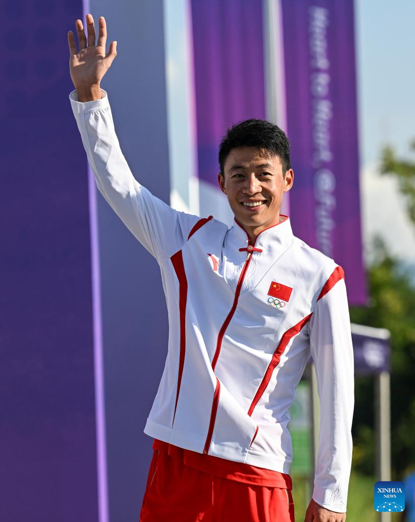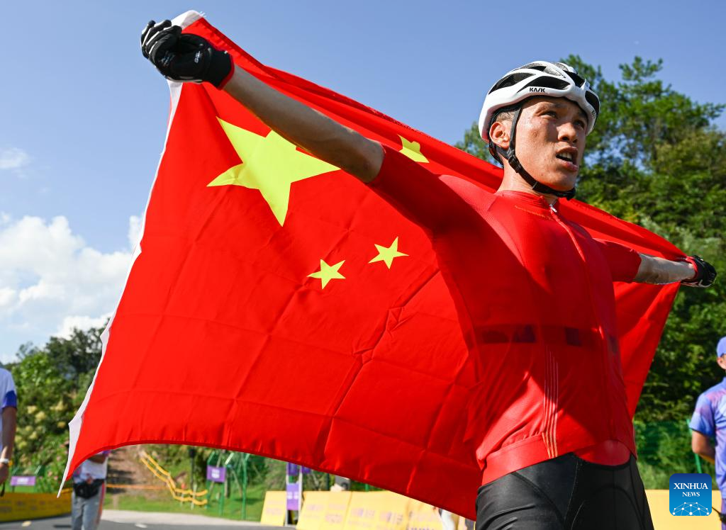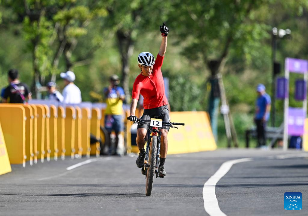Mi Jiujiang of China celebrates after the Cycling Mountain Bike Men's Cross Country Olympic at the 19th Asian Games in Hangzhou, east China's Zhejiang Province, Sept. 25, 2023. (Xinhua/Hu Huhu)