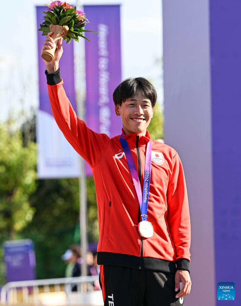 Bronze Medallist Sawada Toki of Japan attends the awarding ceremony for Cycling Mountain Bike Men's Cross Country Olympic at the 19th Asian Games in Hangzhou, east China's Zhejiang Province, Sept. 25, 2023. (Xinhua/Hu Huhu)