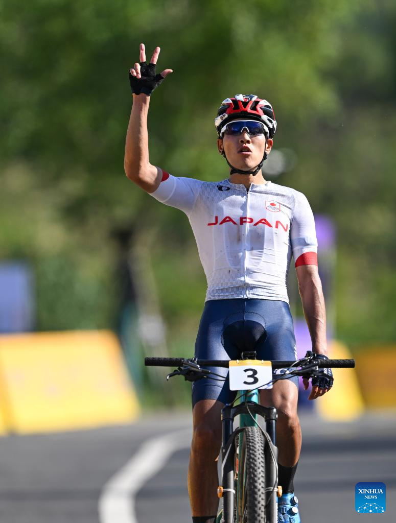 Sawada Toki of Japan celebrates during the Cycling Mountain Bike Men's Cross Country Olympic at the 19th Asian Games in Hangzhou, east China's Zhejiang Province, Sept. 25, 2023. (Xinhua/Hu Huhu)