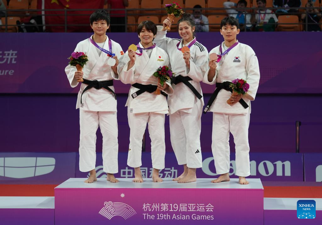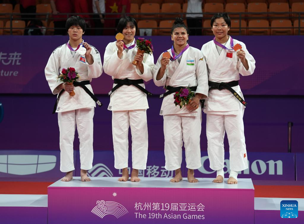 Silver medalist Mun Songhui of the Democratic People's Republic of Korea (DPRK), gold medalist Tanaka Shiho of Japan, bronze medalists Gulnoza Matniyazova of Uzbekistan and Feng Yingying of China (L-R) attend the awarding ceremony for Judo Women's 70kg at the 19th Asian Games in Hangzhou, east China's Zhejiang Province, Sept. 25, 2023. (Xinhua/Wan Xiang)
