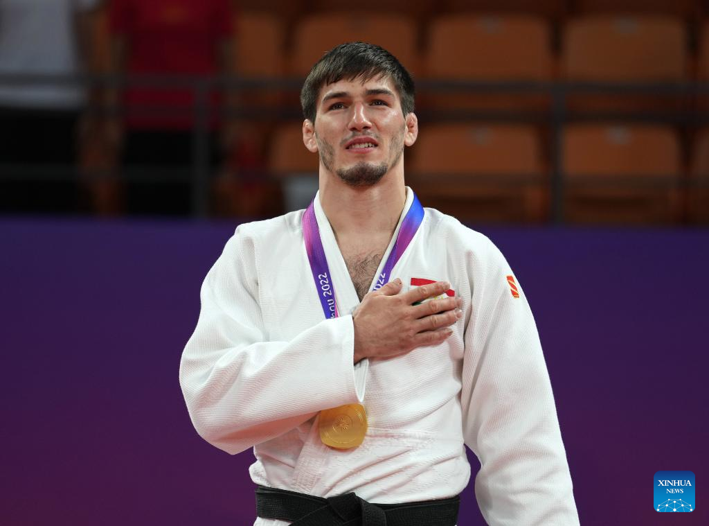 Gold medalist Somon Makhmadbekov of Tajikistan attends the awarding ceremony for Judo Men's 81kg at the 19th Asian Games in Hangzhou, east China's Zhejiang Province, Sept. 25, 2023. (Xinhua/Wan Xiang)