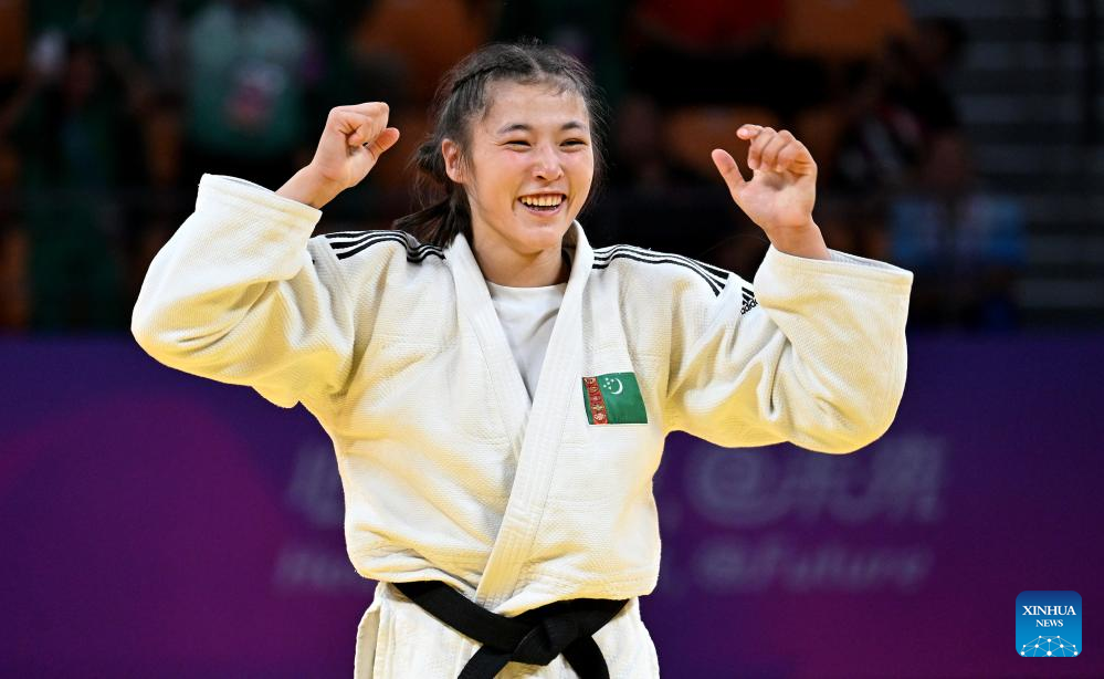 Maysa Pardayeva of Turkmenistan celebrates after the Women's 57kg Contest for Bronze Medal of Judo at the 19th Asian Games in Hangzhou, east China's Zhejiang Province, Sept. 25, 2023. (Xinhua/Li An)