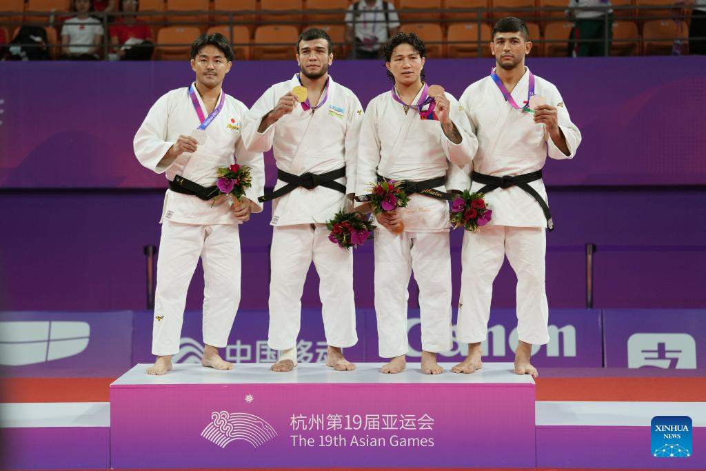 Silver medalist Japan's Hashimoto Soichi, gold medalist Uzbekistan's Murodjon Yuldoshev, bronze medalists Mongolia's Tsogtbaatar Tsend-Ochir and Tajakistan's Behruzi Khojazoda (L-R) attend the awarding ceremony for Judo Men's 73kg at the 19th Asian Games in Hangzhou, east China's Zhejiang Province, Sept. 25, 2023. (Xinhua/Wan Xiang)