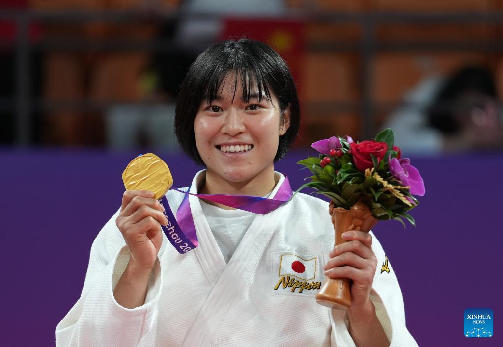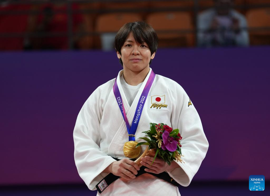 Gold Medalist Takaichi Miku of Japan attends the awarding ceremony for Judo Women's 63kg at the 19th Asian Games in Hangzhou, east China's Zhejiang Province, Sept. 25, 2023. (Xinhua/Wan Xiang)