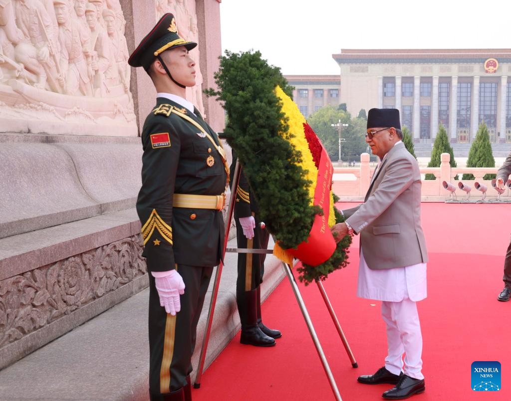 Nepalese Prime Minister Pushpa Kamal Dahal Prachanda lays a wreath at the Monument to the People's Heroes on the Tian'anmen Square in Beijing, capital of China, Sept. 25, 2023. (Xinhua/Liu Weibing)