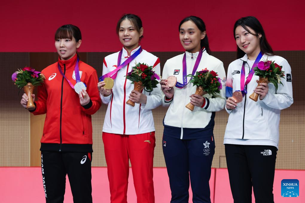 Huang Qianqian (3rd R) of China, Ueno Yuka (1st L) of Japan, CHAN Nok Sze Daphne (2nd R) of China's Hong Kong and Hong Sena of South Korea attend the awarding ceremony of the Women's Foil Individual of Fencing at the 19th Asian Games in Hangzhou, east China's Zhejiang Province, Sept. 25, 2023. (Xinhua/Xu Yu)