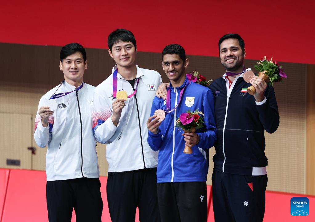(230926) -- HANGZHOU, Sept. 26, 2023 (Xinhua) -- Gold medalist Oh Sanguk (2nd L) of South Korea, silver medalist Gu Bongil (1st L) of South Korea, bronze medalists Alshamlan Yousiff (2nd R) of Kuwait and Rahbari Koyakhi Mohammad of Iran pose for photos during the ceremony after the Men's Sabre Individual Gold Medal Bout of Fencing at the 19th Asian Games in Hangzhou, east China's Zhejiang Province, Sept. 25, 2023. (Xinhua/Yang Lei)