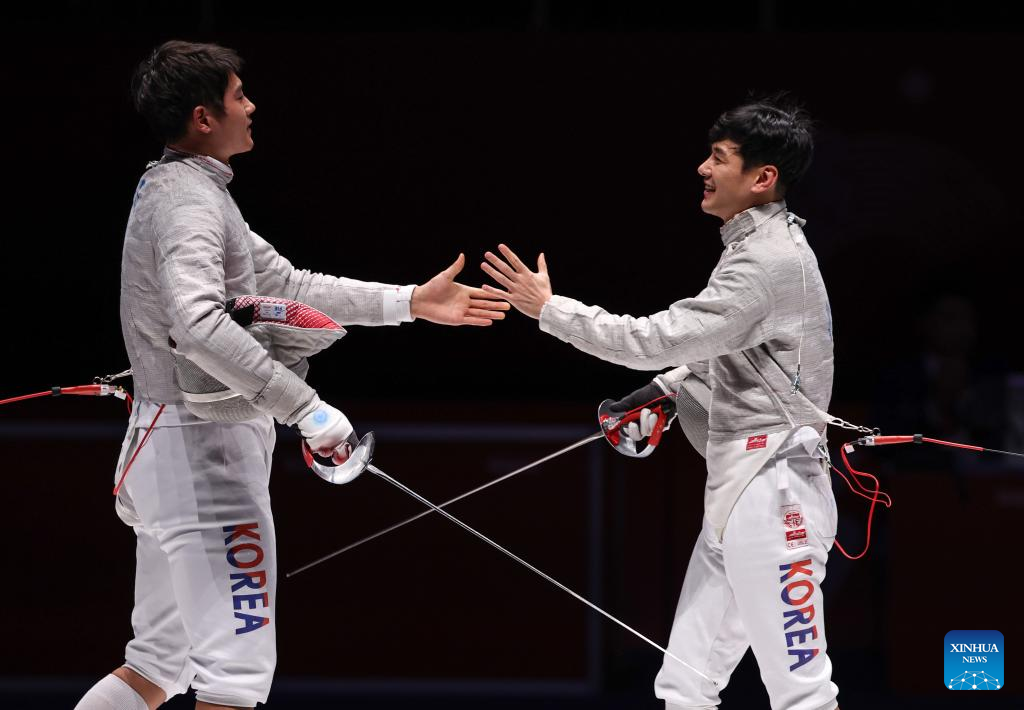 Players of South Korea shake hands after the Men's Sabre Individual Gold Medal Bout of Fencing at the 19th Asian Games in Hangzhou, east China's Zhejiang Province, Sept. 25, 2023. (Xinhua/Yang Lei)