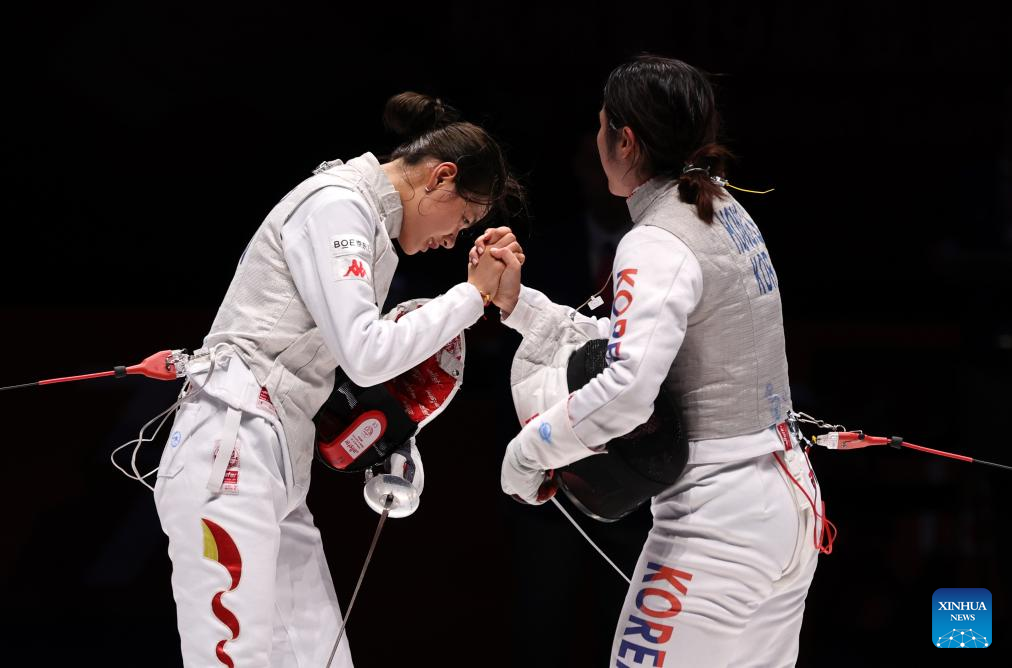 Huang Qianqian (L) of China shakes hands with Hong Sena of South Korea after the Women's Foil Individual Semifinal of Fencing between China and South Korea at the 19th Asian Games in Hangzhou, east China's Zhejiang Province, Sept. 25, 2023. (Xinhua/Yang Lei)
