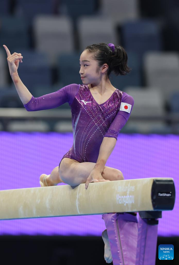 Okamura Mana of Japan competes on the balance beam of Women's Qualification and Team Final of artistic gymnastics at the 19th Asian Games in Hangzhou, east China's Zhejiang Province, Sept. 25, 2023. (Xinhua/Cheng Tingting)