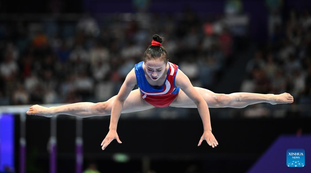 Kim Sujong of the Democratic People's Republic of Korea (DPRK) competes on the floor of Women's Qualification and Team Final of artistic gymnastics at the 19th Asian Games in Hangzhou, east China's Zhejiang Province, Sept. 25, 2023. (Xinhua/Cheng Min)