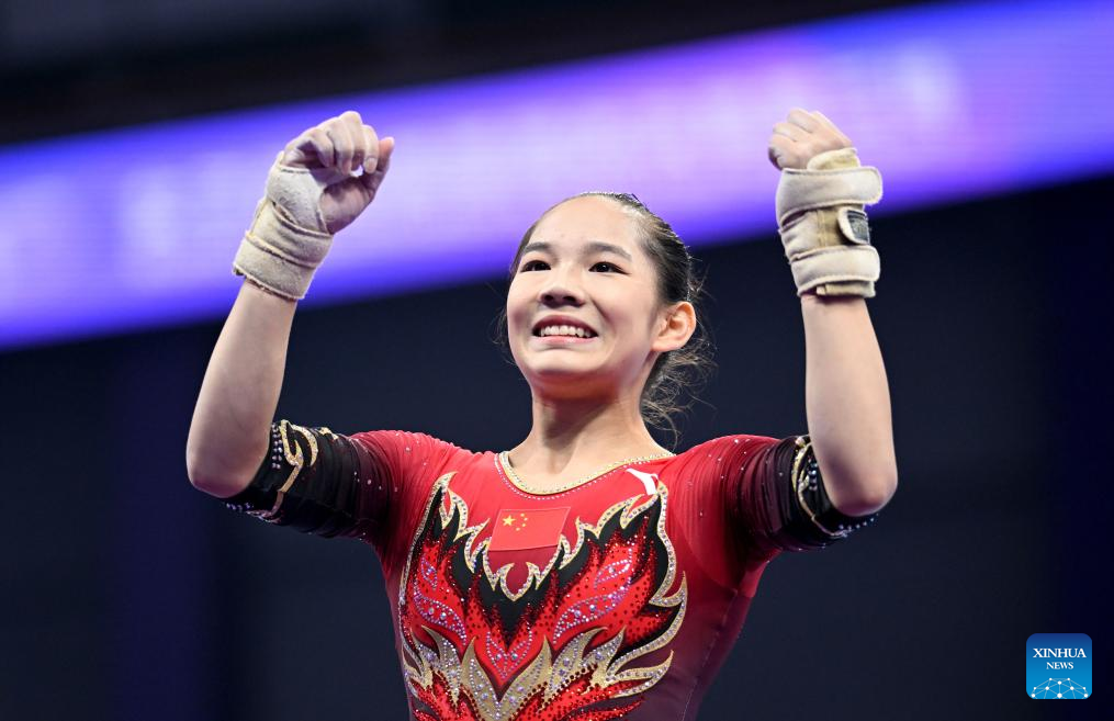 Zuo Tong of China competes on the uneven bars of Women's Qualification and Team Final of artistic gymnastics at the 19th Asian Games in Hangzhou, east China's Zhejiang Province, Sept. 25, 2023. (Xinhua/Cheng Min)