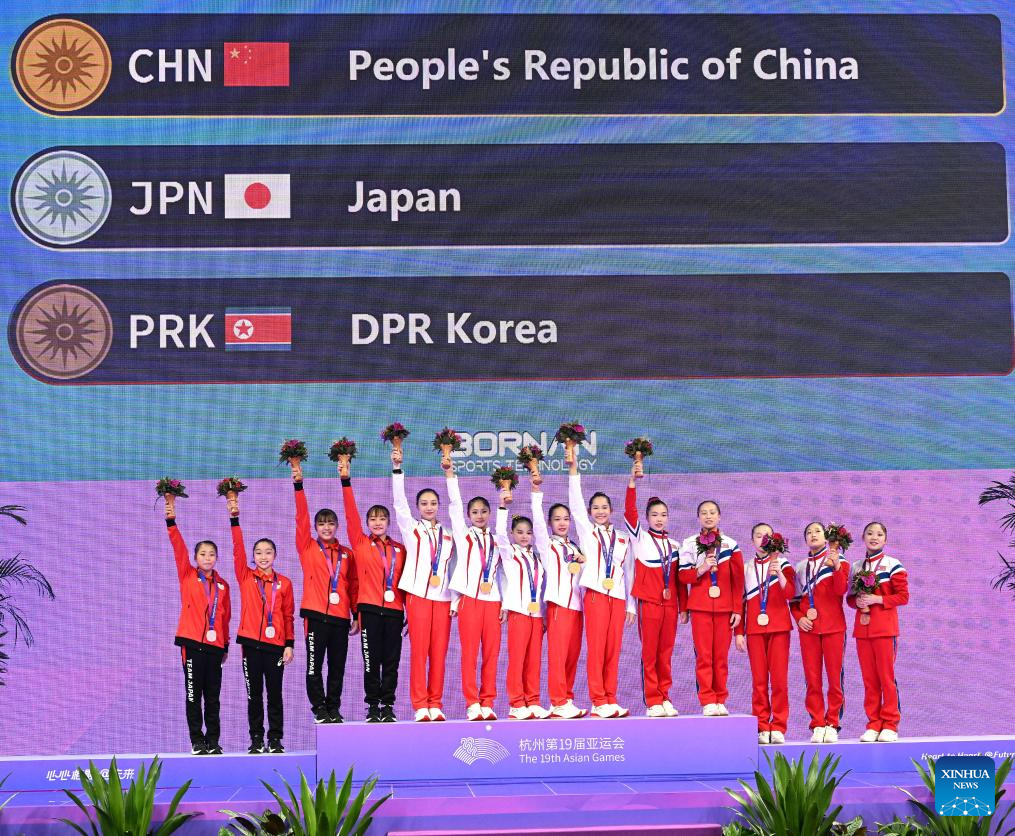 Gold Medalists of Team China, Silver Medalists of Team Japan, Bronze Medalists of Team Democratic People's Republic of Korea (DPRK) attend the awarding ceremony after Women's Qualification and Team Final of artistic gymnastics at the 19th Asian Games in Hangzhou, east China's Zhejiang Province, Sept. 25, 2023. (Xinhua/Cheng Min)