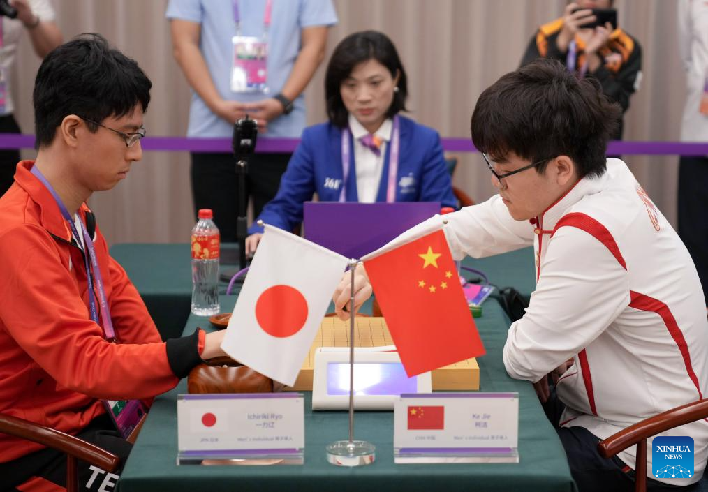 Ke Jie (R) of China competes against Ichiriki Ryo of Japan during the Men's Individual Preliminary Round of Go Chess at the 19th Asian Games in Hangzhou, east China's Zhejiang Province, Sept. 25, 2023. (Xinhua/Han Chuanhao)