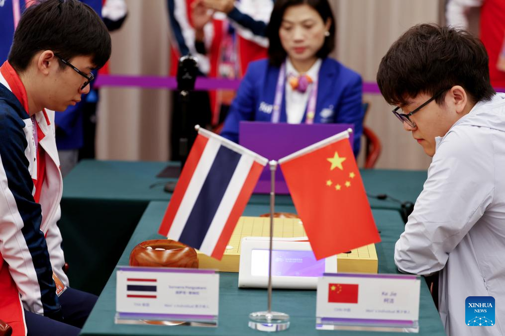 Pongsakarn Sornarra (L) of Thailand competes against Ke Jie of China during the Men's Individual Preliminary Round of Go Chess at the 19th Asian Games in Hangzhou, east China's Zhejiang Province, Sept. 26, 2023. (Xinhua/Gong Bing)