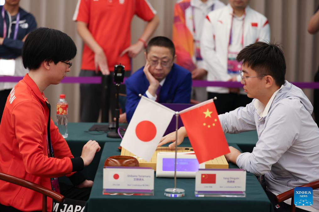 Yang Dingxin (R) of China competes against Shibano Toramaru of Japan during the Men's Individual Preliminary Round of Go Chess at the 19th Asian Games in Hangzhou, east China's Zhejiang Province, Sept. 26, 2023. (Xinhua/Gong Bing)