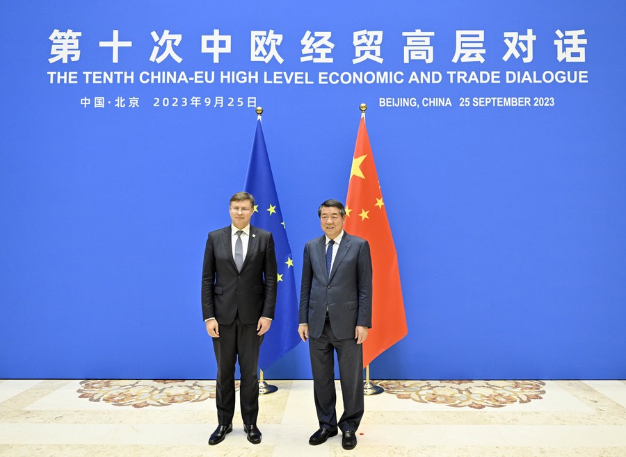 Chinese Vice Premier He Lifeng, also a member of the Political Bureau of the Communist Party of China Central Committee, co-chairs the 10th China-EU High-level Economic and Trade Dialogue with Valdis Dombrovskis, executive vice president of the European Commission, in Beijing, capital of China, Sept. 25, 2023. (Xinhua/Yin Bogu)