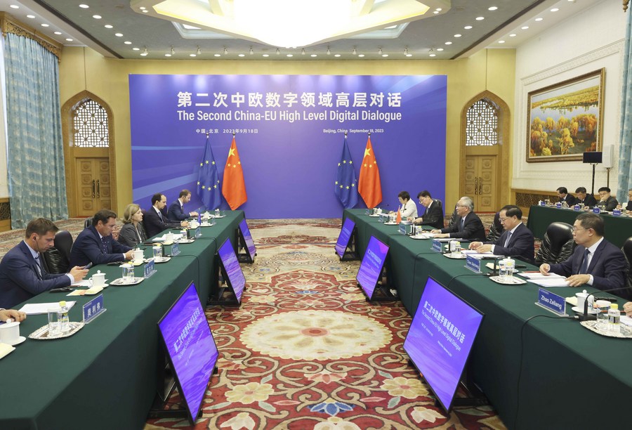 Chinese Vice Premier Zhang Guoqing, also a member of the Political Bureau of the Communist Party of China Central Committee, and European Commission Vice President Vera Jourova co-chair the second China-EU high-level dialogue in the digital area in Beijing, capital of China, Sept. 18, 2023. (Xinhua/Liu Weibing)