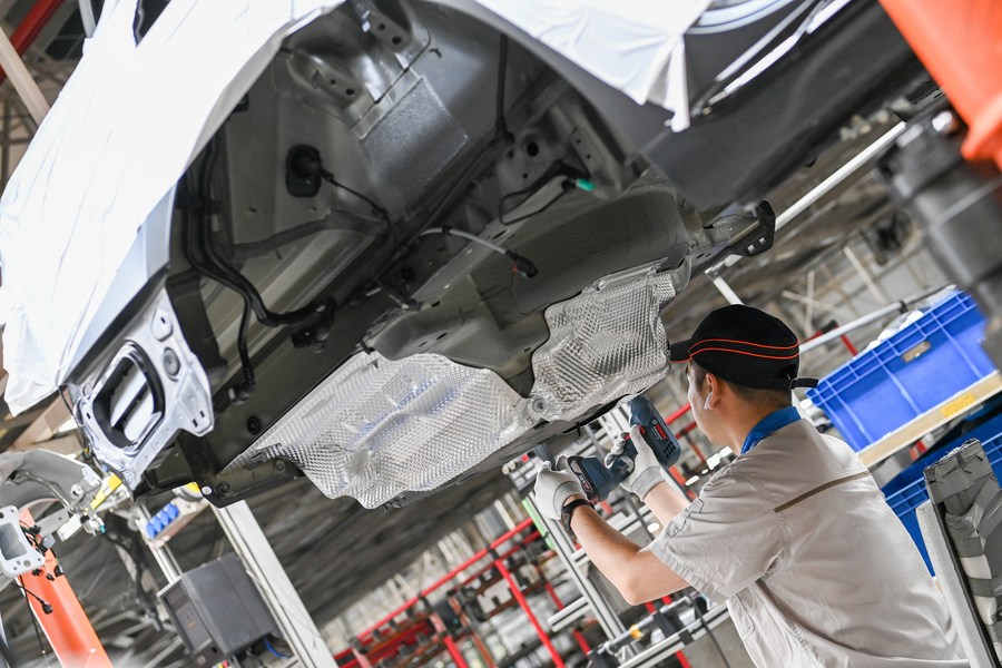 This photo taken on June 12, 2023 shows a worker assembling vehicles at the general assembly line of FAW-Volkswagen in Changchun, northeast China's Jilin Province. (Xinhua/Yan Linyun)