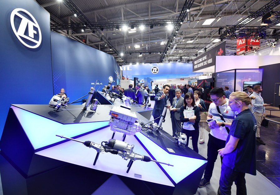 People visit the booth of ZF during the 2023 International Motor Show, officially known as the IAA MOBILITY 2023, in Munich, Germany, Sept. 5, 2023. (Xinhua/Ren Pengfei)