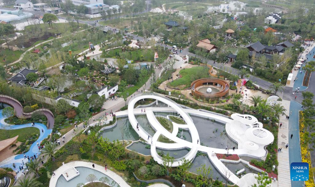 This aerial photo taken on Sept. 26, 2023 shows a view at the 14th China (Hefei) International Garden Expo in Hefei, east China's Anhui Province. The expo opened in Hefei on Tuesday, attracting 38 cities to showcase the characteristics of their gardens. (Xinhua/Zhou Mu)