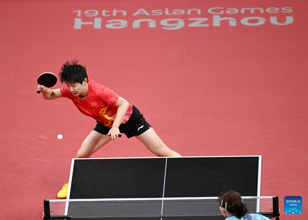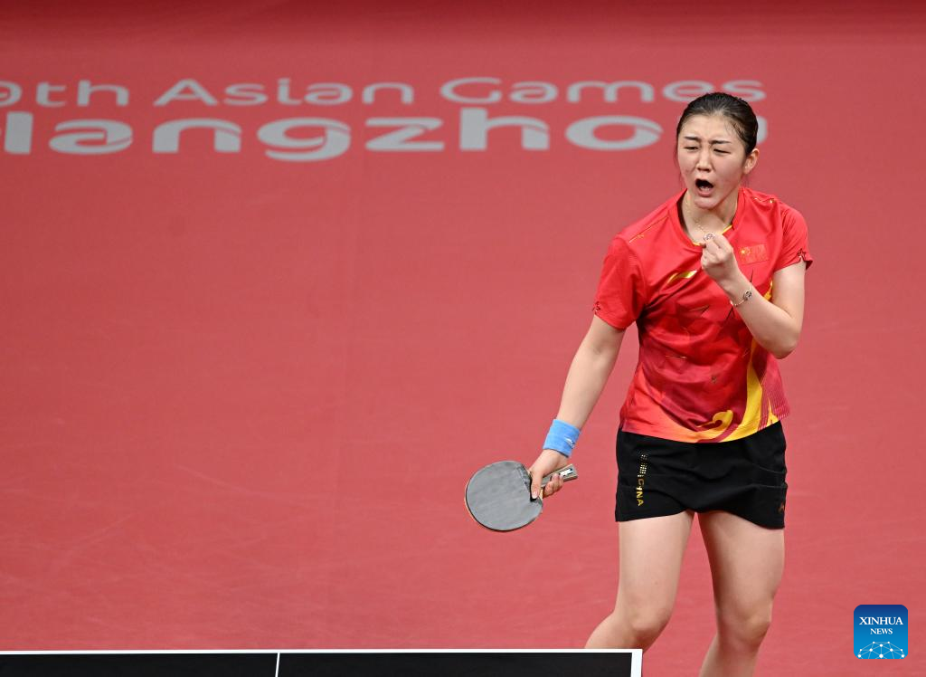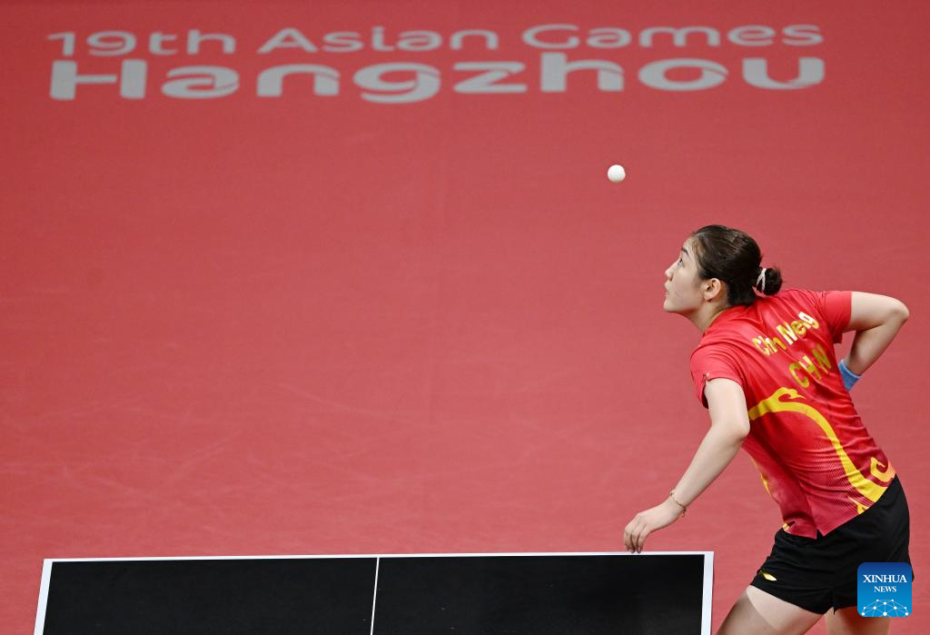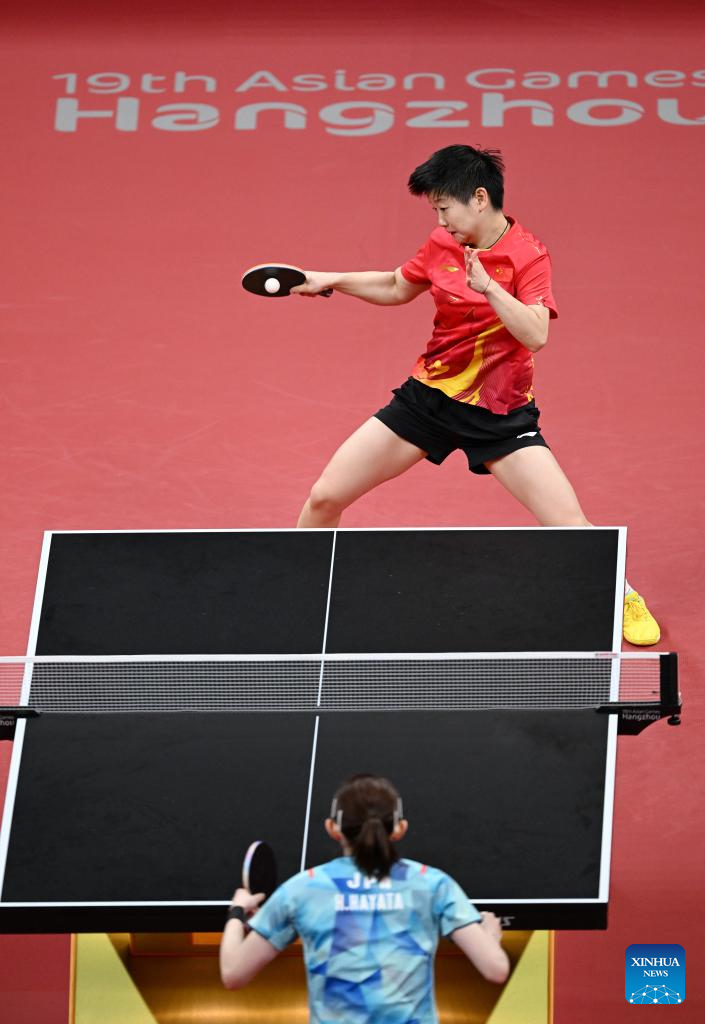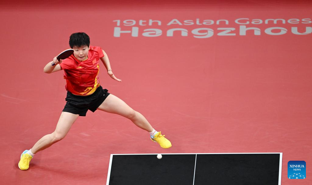 Sun Yingsha of China competes during the women's team finals table tennis match between China and Japan at the 19th Asian Games in Hangzhou, east China's Zhejiang Province, Sept. 26, 2023. (Xinhua/Wang Peng)