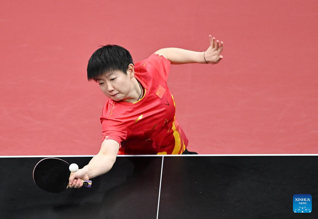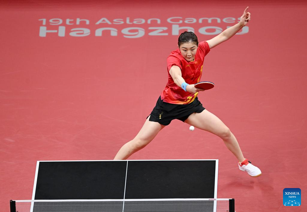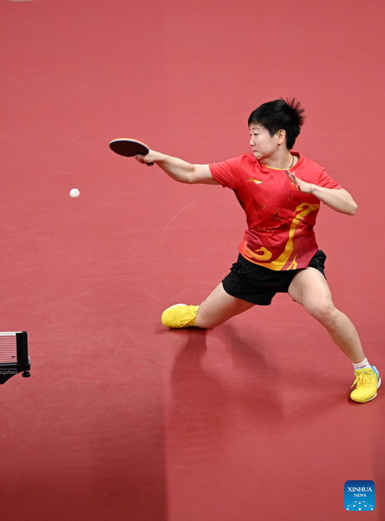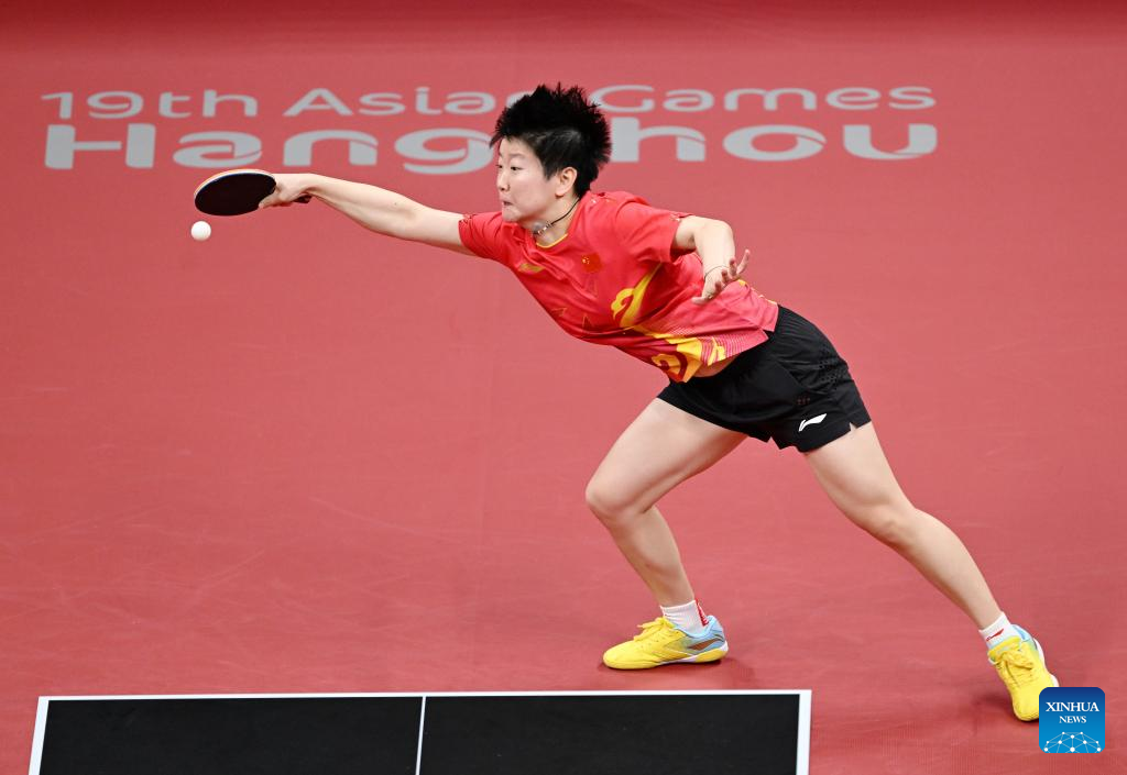 Sun Yingsha of China competes during the women's team finals table tennis match between China and Japan at the 19th Asian Games in Hangzhou, east China's Zhejiang Province, Sept. 26, 2023. (Xinhua/Wang Peng)