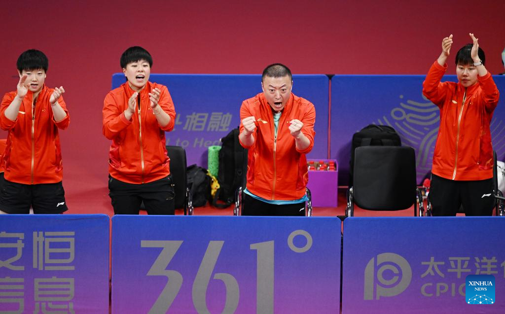 Team China react during the women's team finals table tennis match between China and Japan at the 19th Asian Games in Hangzhou, east China's Zhejiang Province, Sept. 26, 2023. (Xinhua/Wang Peng)