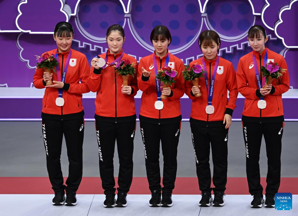 Silver Medalists of Team Japan attend the awarding ceremony of the women's team table tennis at the 19th Asian Games in Hangzhou, east China's Zhejiang Province, Sept. 26, 2023. (Xinhua/Wang Peng)