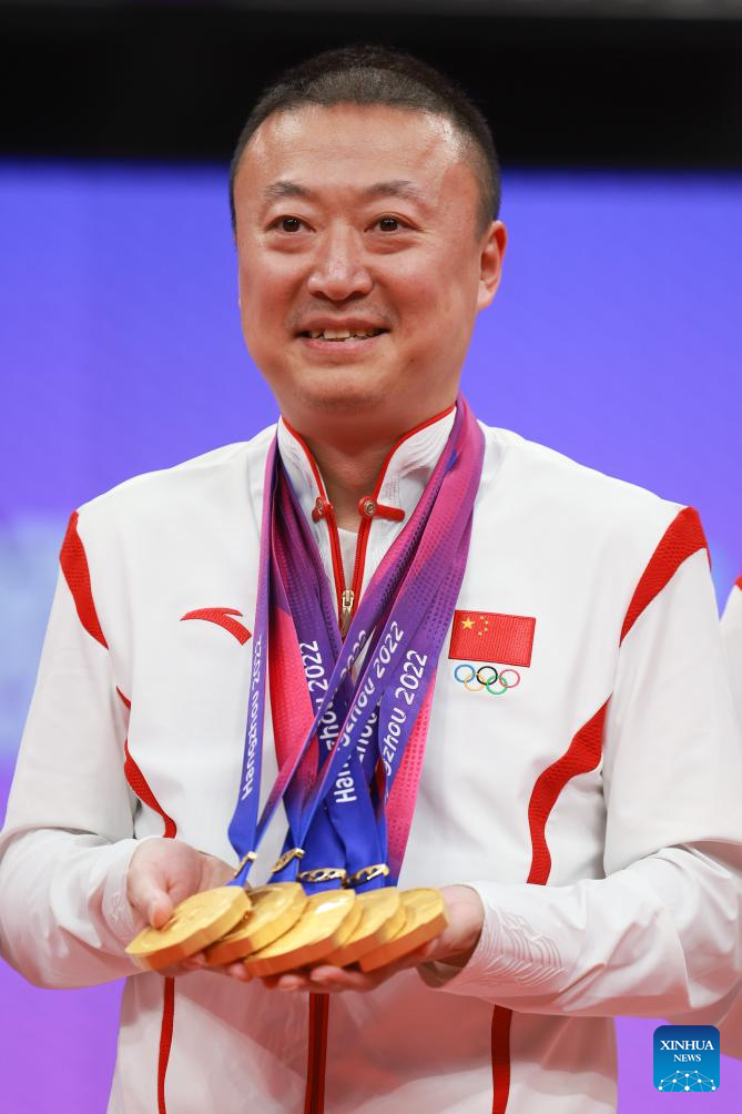 Coach Ma Lin of China shows medals after the awarding ceremony of the women's team table tennis match at the 19th Asian Games in Hangzhou, east China's Zhejiang Province, Sept. 26, 2023. (Xinhua/Liu Xu)