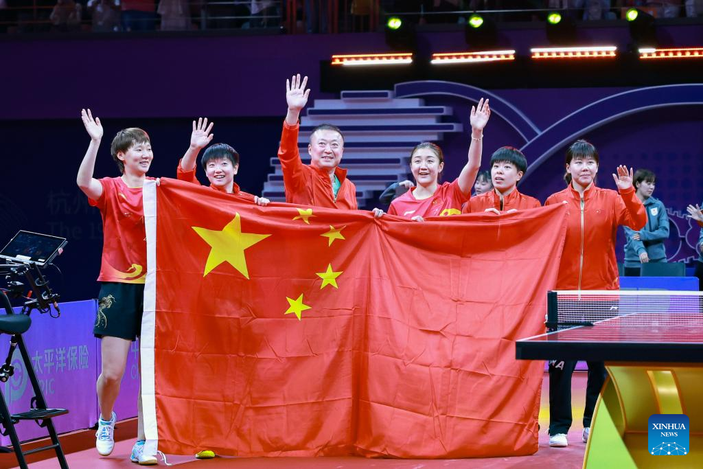 Team China celebrate after the women's team finals table tennis match between China and Japan at the 19th Asian Games in Hangzhou, east China's Zhejiang Province, Sept. 26, 2023. (Xinhua/Liu Xu)