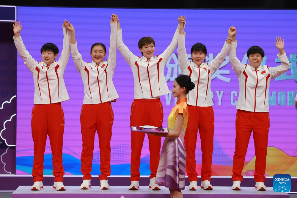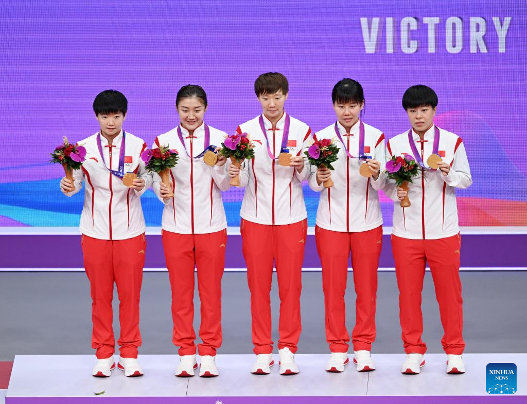 Gold Medalists of Team China attend the awarding ceremony of the women's team table tennis at the 19th Asian Games in Hangzhou, east China's Zhejiang Province, Sept. 26, 2023. (Xinhua/Wang Peng)