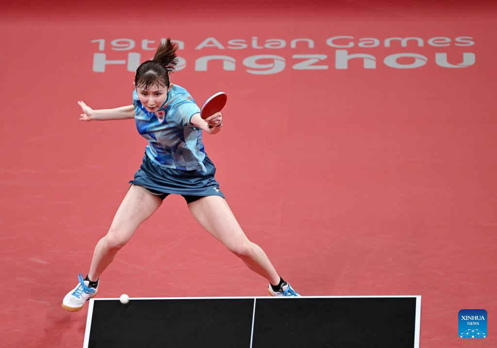 Hayata Hina of Japan competes during the women's team finals table tennis match between China and Japan at the 19th Asian Games in Hangzhou, east China's Zhejiang Province, Sept. 26, 2023. (Xinhua/Wang Peng)