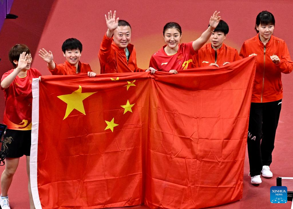 Team China celebrate after the women's team finals table tennis match between China and Japan at the 19th Asian Games in Hangzhou, east China's Zhejiang Province, Sept. 26, 2023. (Xinhua/Wang Peng)