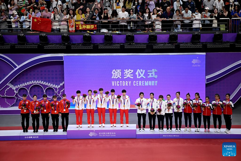 Gold Medalists of Team China, Silver Medalists of Team Japan, Bronze Medalists of South Korea and Thailand, attend the awarding ceremony of the women's team table tennis at the 19th Asian Games in Hangzhou, east China's Zhejiang Province, Sept. 26, 2023. (Xinhua/Wang Peng)