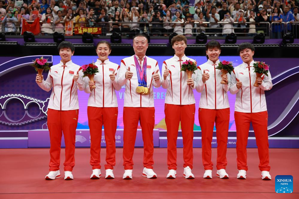 Gold Medalists of Team China attend the awarding ceremony of the women's team table tennis at the 19th Asian Games in Hangzhou, east China's Zhejiang Province, Sept. 26, 2023. (Xinhua/Liu Xu)