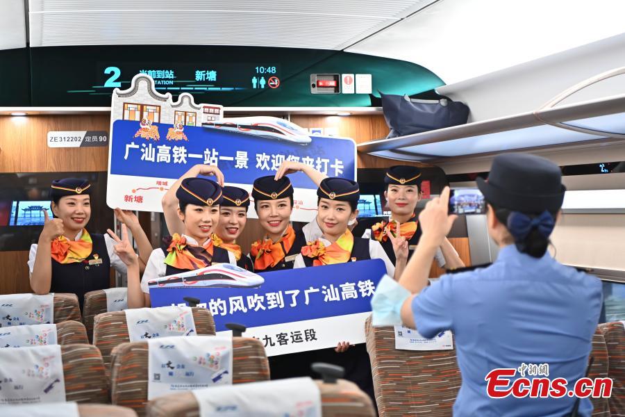 The high-speed train G6418 departed from Guangzhou East railway station and arrived at Shanwei railway station after about 73 minutes, marking the official opening of the Guangzhou-Shanwei high-speed railway in Guangdong Province on Tuesday.
