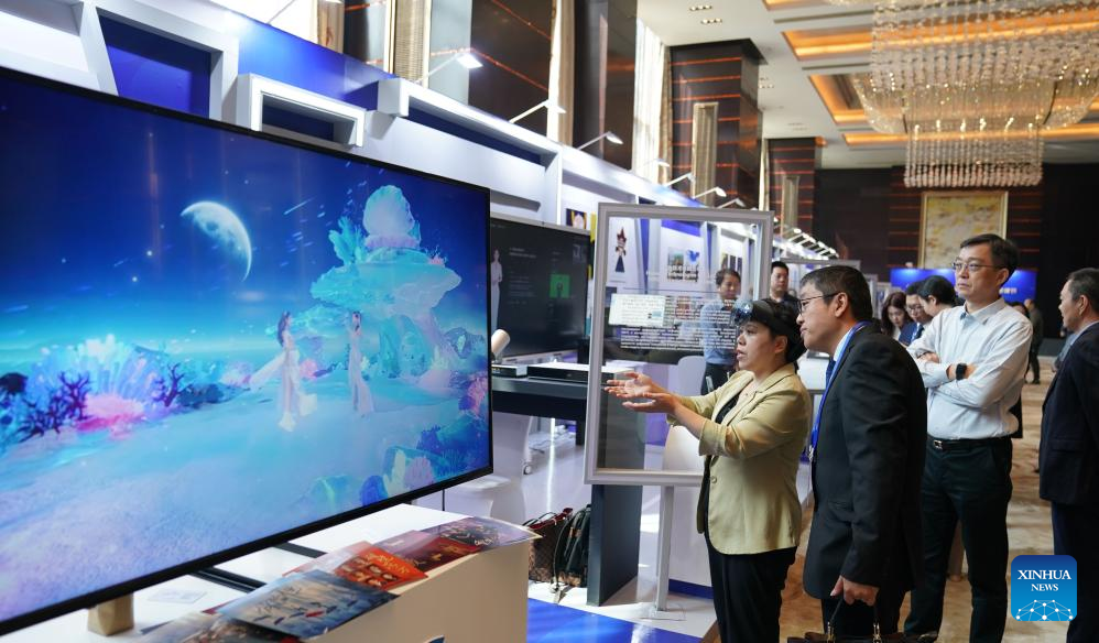 Guests visit an exhibition of TV technologies and TV program content during the 2023 Shanghai Cooperation Organization (SCO) TV Festival in Nanjing, east China's Jiangsu Province, Sept. 26, 2023. (Xinhua/Lin Kai)