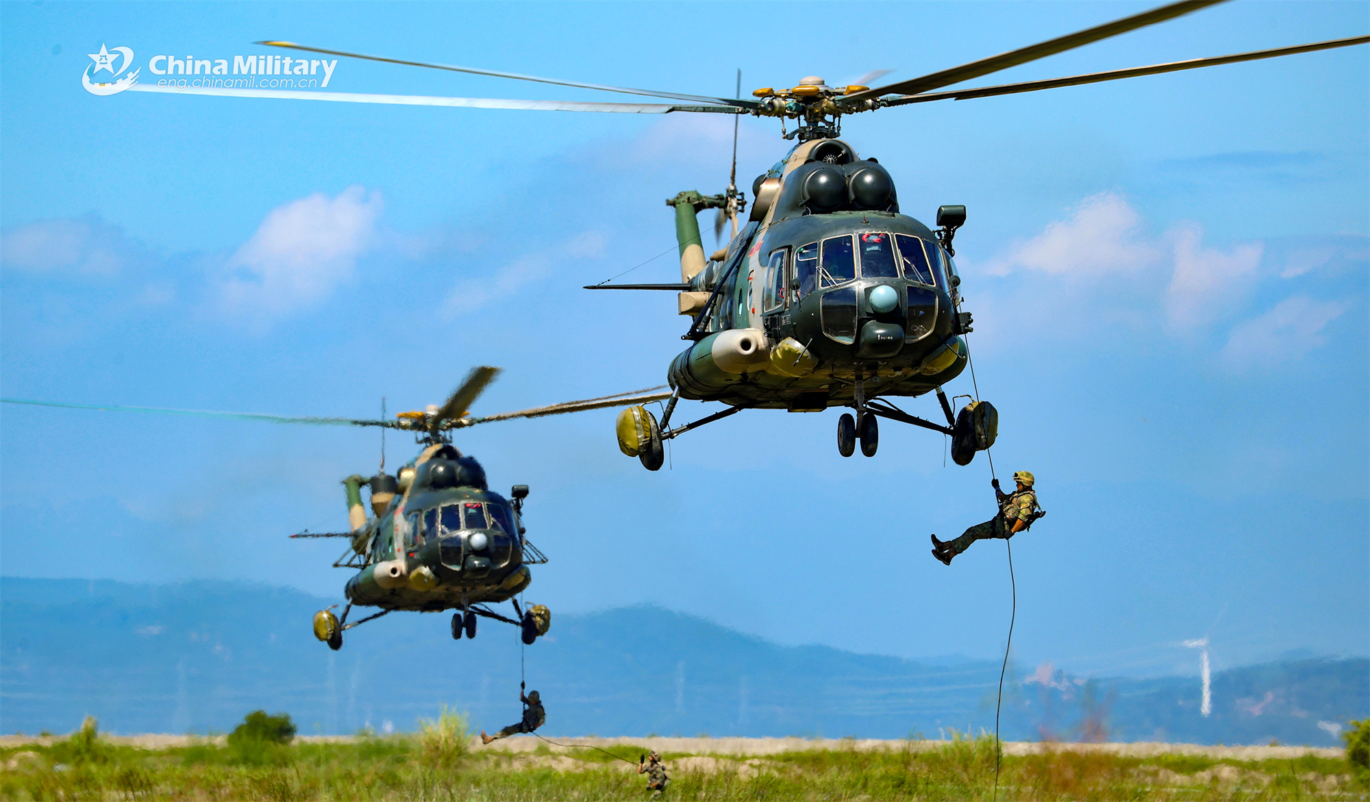 Soldiers assigned to a combined-arms brigade fast rope down from transport helicopters attached to an army aviation brigade of the PLA 72nd Group Army during a coordination training exercise on September 11, 2023. (eng.chinamil.com.cn/Photo by Zhang Huanpeng)